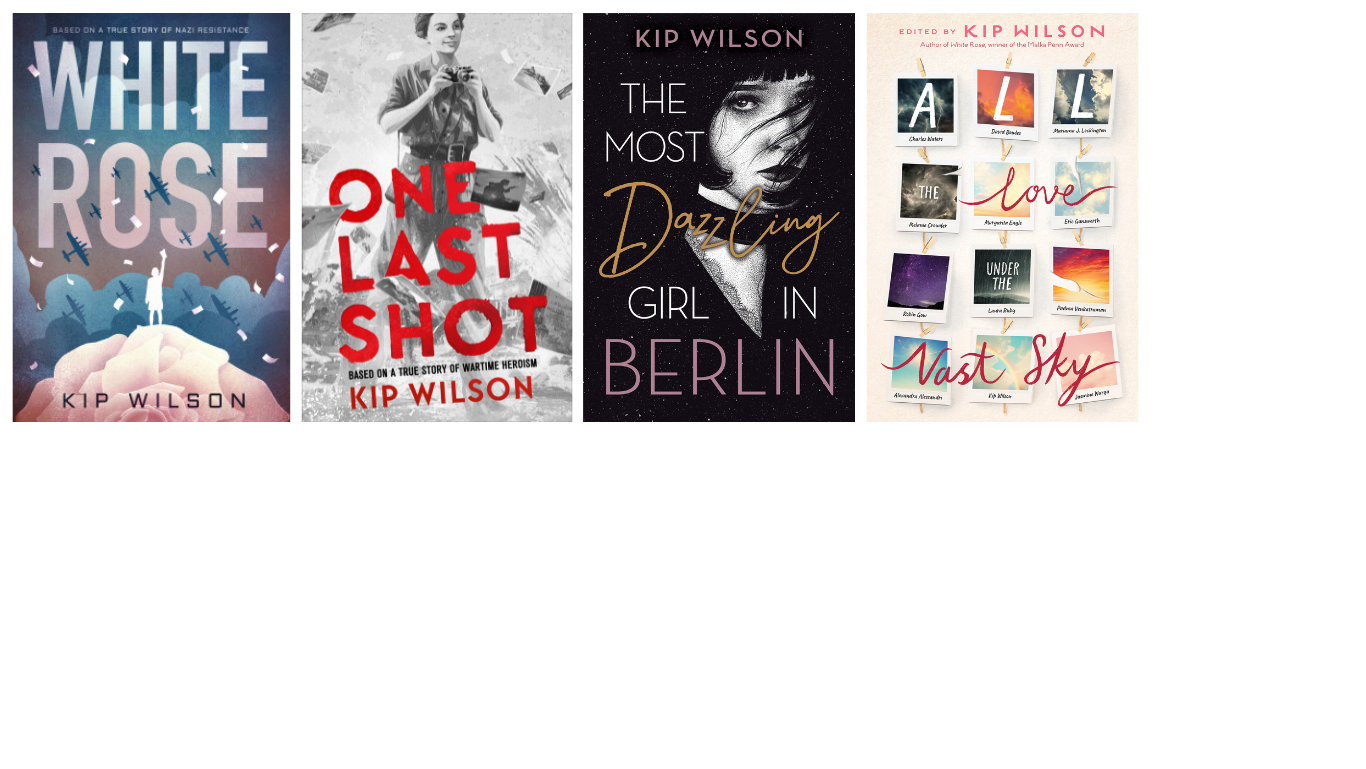 Kip Wilson is the critically acclaimed YA author of verse novels White Rose (Versify, 2019), The Most Dazzling Girl in Berlin (Versify, 2022), and One Last Shot (Versify, 2023). Awards for her books include the Malka Penn Award and the Julia Ward Howe Award, and her books have been named a Massachusetts Book Honor title, an Amelia Elizabeth Walden Award finalist, and a Los Angeles Times Book Award finalist. She is also the editor of and a contributor to All the Love Under the Vast Sky (Nancy Paulsen Books, 2025), a YA anthology of stories in verse. Kip holds a Ph.D. in German Literature and is an enthusiastic high school librarian.