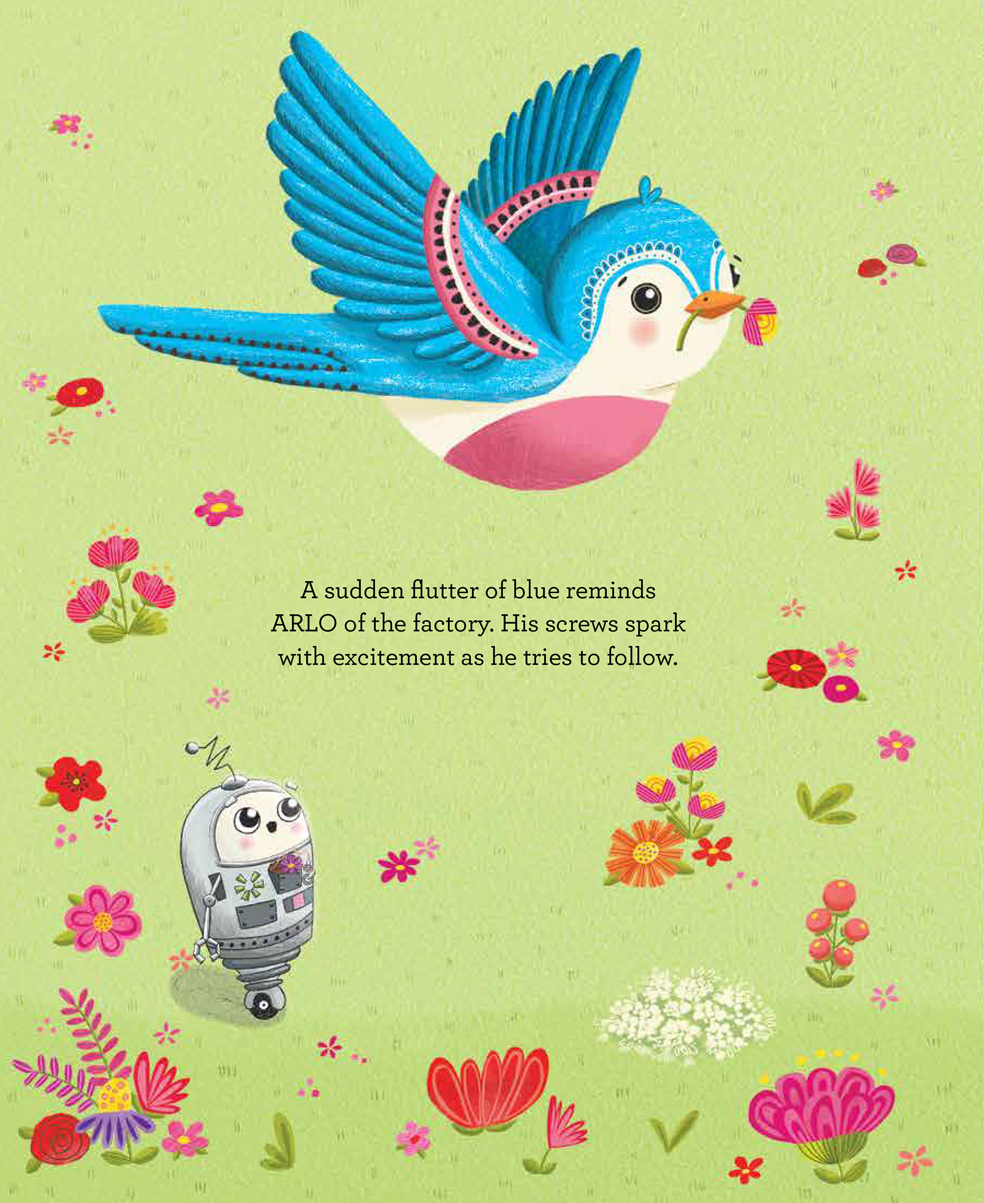 "Gholz’s lively text is peppered with the sounds of imaginative robotic language and onomatopoeia, well matched by Haley’s art, which effectively portrays cute, round-eyed robots, drab factory conditions, and colorful, comical nature scenes. Quirky, thoughtful, and fun." - Kirkus